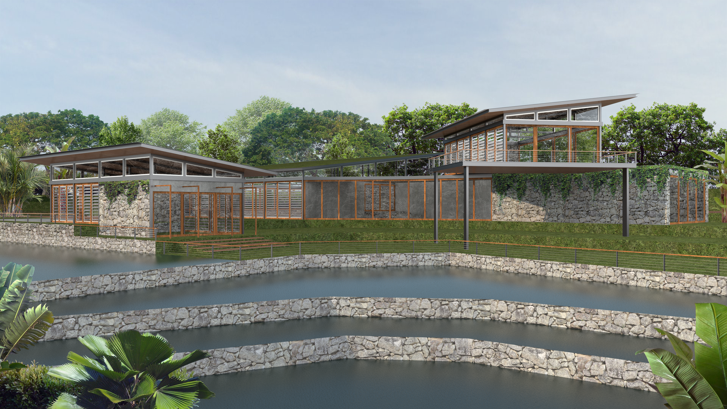 The house is sprawled throughout the natural levels of the site to blend with the lush landscape of the Honduran countryside. Through large glass windows and doors, and with stone extracted from the river to build walls, the house completely loses its indoor / outdoor separation.